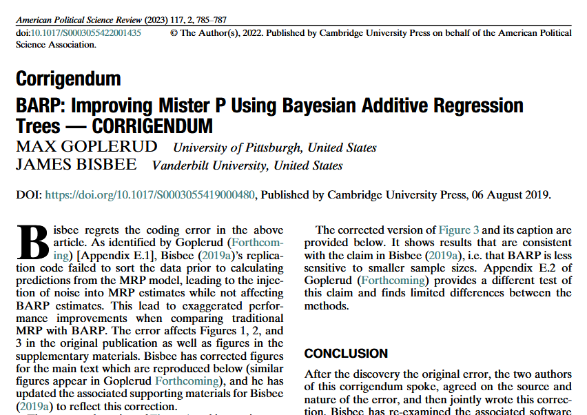 After some preliminary exploration, I discovered an error in Bisbee (2019)’s replication archive. […]. In brief, the error arbitrarily injected random noise into the MRP estimates at the prediction stage. When this is corrected, traditional MRP’s performance increases markedly and is only slightly beaten by BART. (Goplerud 2023, p 533)