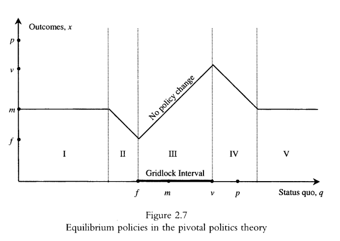 The theory of pivotal politics identifies a single, conceptually tidy, necessary and sufficient condition for breaking gridlock. Policy change requires that the status quo must lie outside the gridlock interval, as defined by the president, filibuster, and veto pivots in theory and illustrated in figures 2.7 and 2.8 as interval III. […].