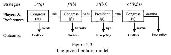 Behavior: “Players in the game are assumed to adopt strategies that maximize their utility, conditional on the expectation that all other players in future stages of the game do likewise. The equilibrium concept is subgame perfect Nash. […]. More formally, an equilibrium is an optimal bill, \(b^*\), which is a function of the exogenous status quo, \(q\), and which is predicated on rational expectations about future behavior; an optimal filibuster choice \(f^*\) which is a function of \(b\) and which is predicated on rational expectations about future behavior; an optimal veto choice \(v^*\) which is a function of \(b\) and \(f\) and which is predicated on rational expectations about future behavior; and an optimal override choice, \(o^*\), which is a function of \(b\), \(f\), and \(v\).” (Krehbiel 1998, 26)